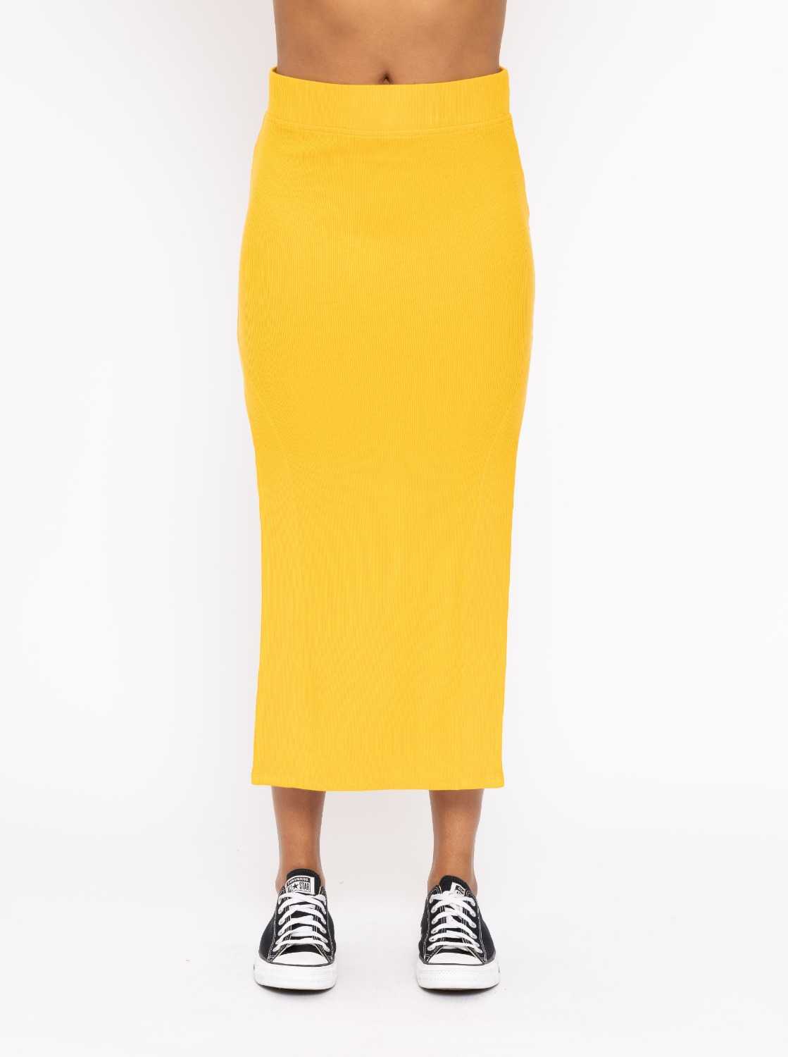 This ribbed midi skirt is a must-have for any occasion. It features a ribbed texture, a flattering high-waisted silhouette, and double side slits starting at mid-thigh for added style and movement.
