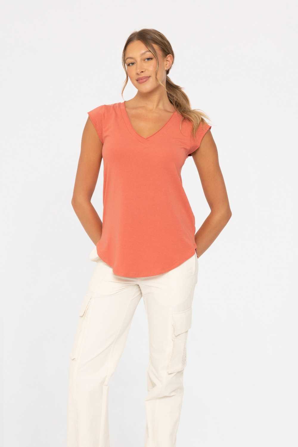 This relaxed tee takes the V game to another level. It features a V-neck with raw edges and collar stitching and short cap sleeves that further give that V silhouette to achieve an hourglass effect. The curved hemline softens the angles and creates a relaxed look.