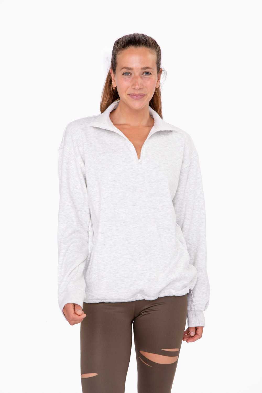 This half-zip pullover features a soft brushed outside with a fleece inside. It has front pockets, a drawstring cord on both sides of bottom hem, and ribbed cuffs.