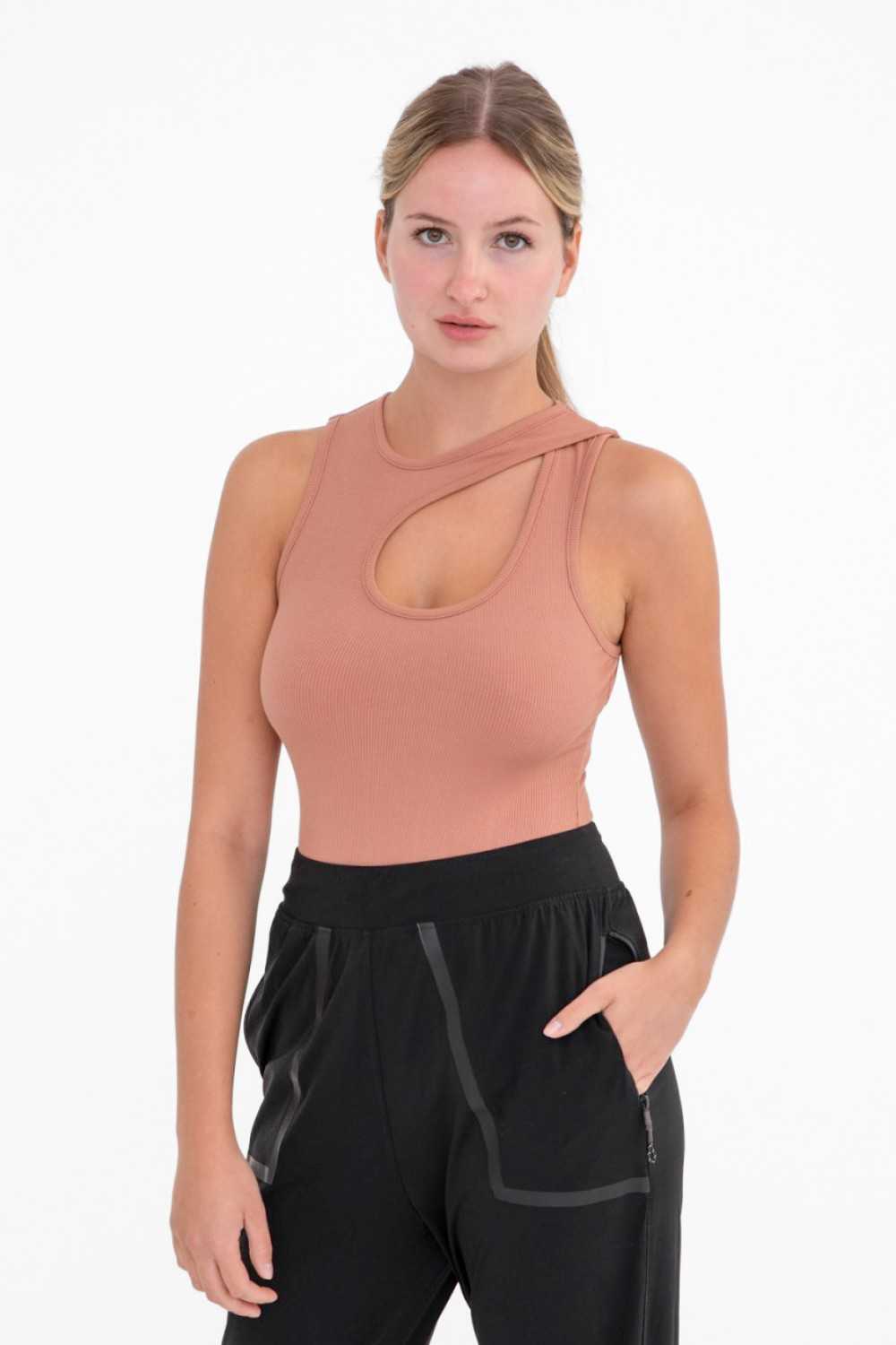 This chic sleeveless bodysuit features an all-over rib, a keyhole cut-out design on one shoulder, and snap-on panty for easy wearability.
