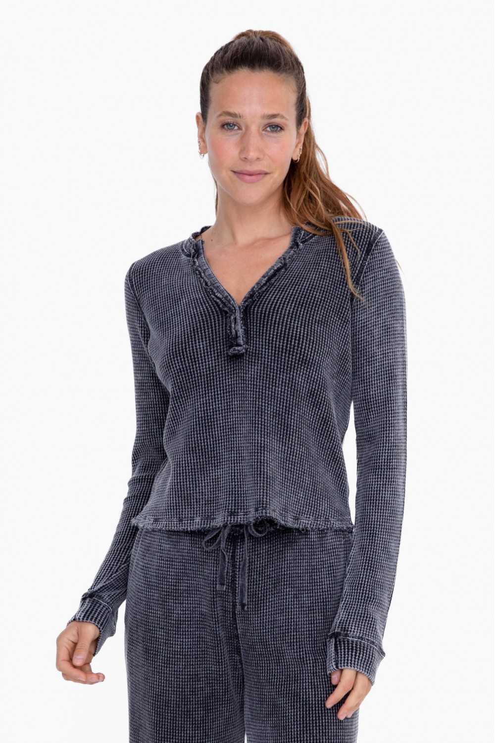 Our mineral-washed long-sleeve Henley style top is an effortless essential. The distressed details and vintage look give a bit of edge, while the waffle knit design and 100% cotton fabrication makes this top super soft. It's accented with a partial button placket on the front and has a comfortable boxy fit.
