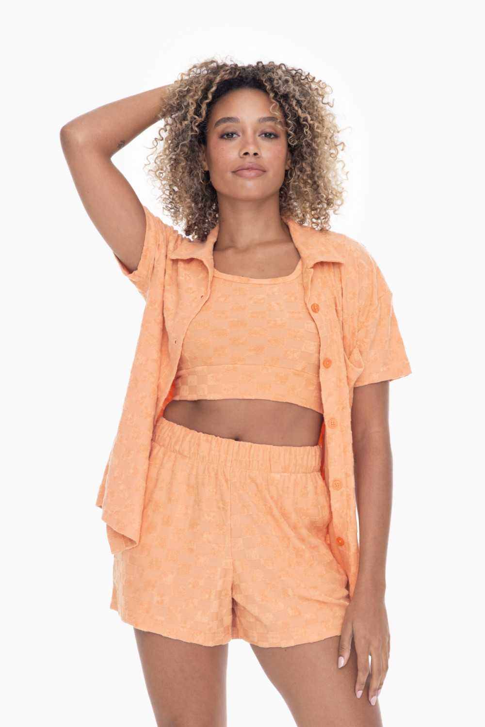 Who's ready for warmer weather? This set is the perfect addition to your collection. Made using a terry fabric in an all-over checkerboard pattern, this set is soft and cooling. The shorts have an elastic waist and the boxy short sleeve button up has chest pockets and vents at the hem.