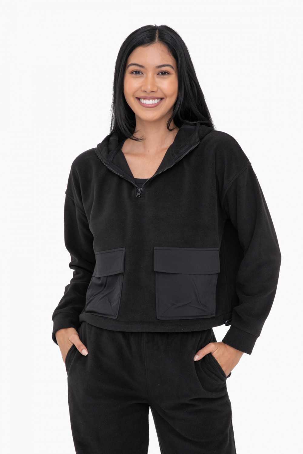 A cozy and sporty addition to your wardrobe, our fuzzy fleece hoodie is warm & lightweight. It features a half zip popover design, woven flap pockets with hidden zip pockets, and an adjustable bungee at the hem.