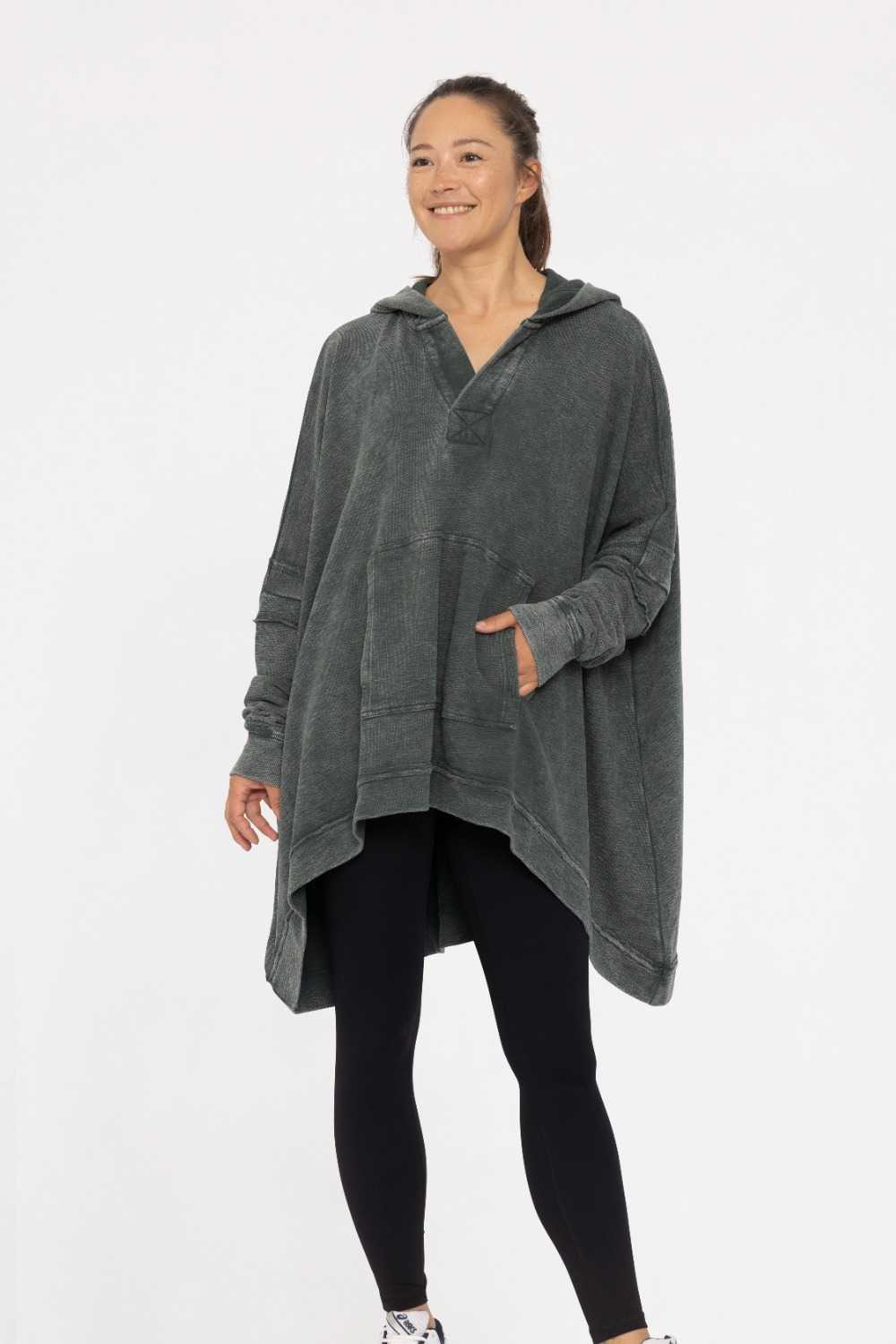 Add a cozy boho layer to your wardrobe with our oversized poncho-style hoodie. Featuring a loose fit, kangaroo pocket, textured jacquard knit fabric, raw edge details, and a high-low hem.