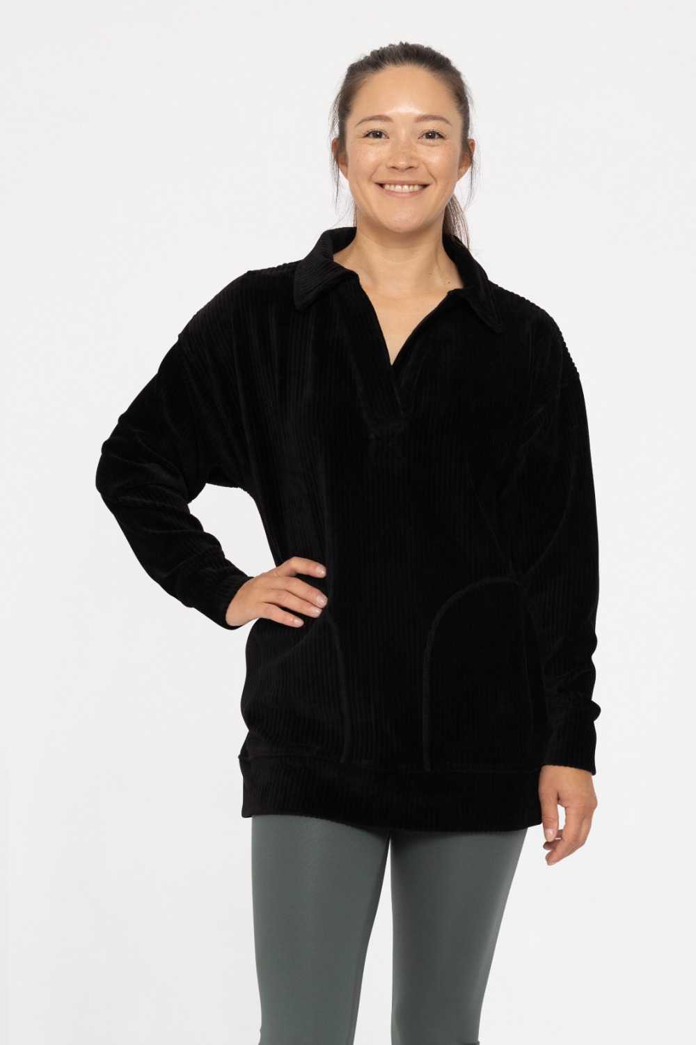 Soft and cozy, this collared pullover top is made from a stretchy corduroy fabric. It features an oversized tunic fit, split neck, oversized pockets, and cuffed sleeves & hem.