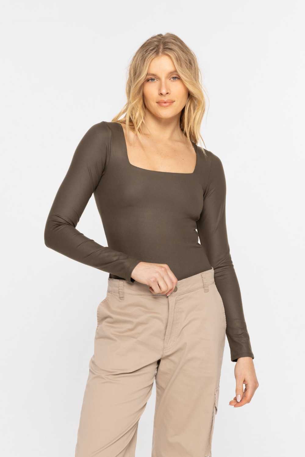Complete any look in our square neck long sleeve bodysuit! It features a coated interlock fabric, snap closure at the crotch, and a fully lined bodice with power mesh.