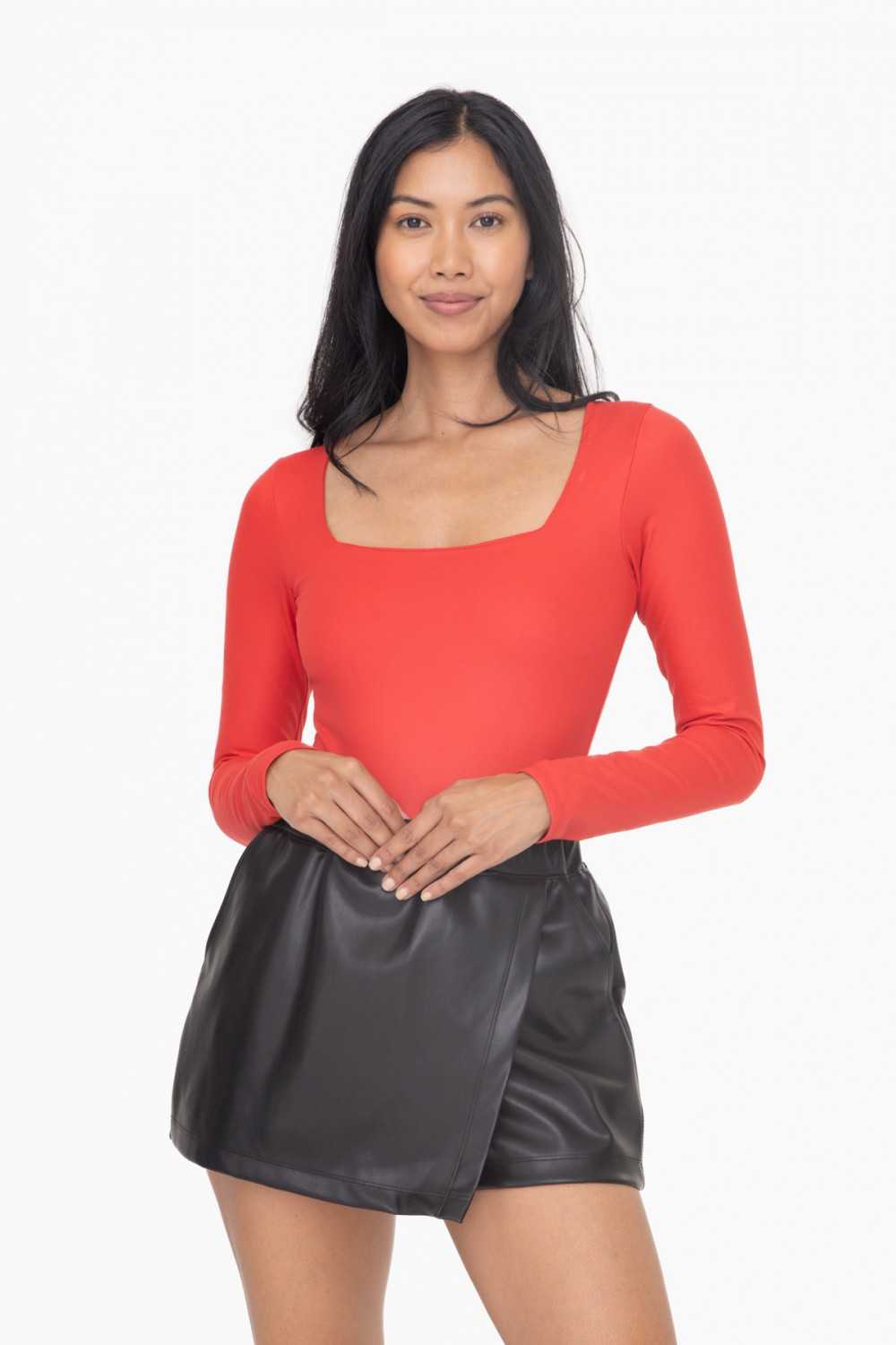 Complete any look in our square neck long sleeve bodysuit! It features a coated interlock fabric, snap closure at the crotch, and a fully lined bodice with power mesh.