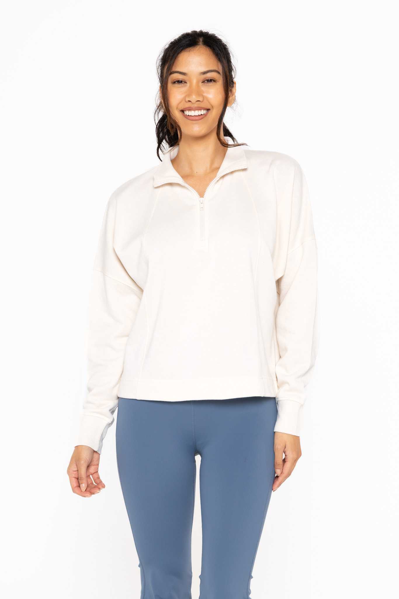 Cozy up in our fleece half-zip with a brushed inside, dolman-style sleeves, princess panels, a ribbed high neck, and a relaxed boxy fit.