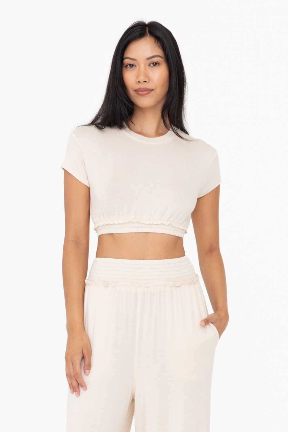 Stay cool in this boxy lounge tee that is made from a lightweight, breathable rayon span jersey. It features a raw edge hem and a smocking panel at the waist.