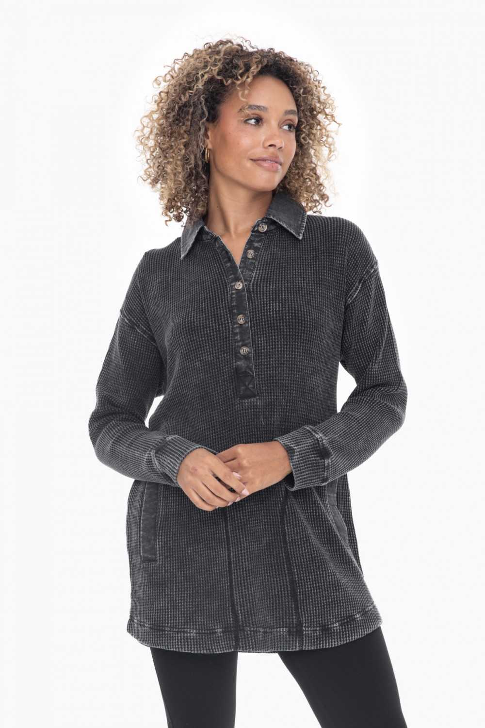 Made from a soft cotton mineral wash waffle knit fabric, our longline tunic top is a versatile addition to your closet. The popover style with half button placket allows for easy on and off and features a contrast woven collar and hand pockets.