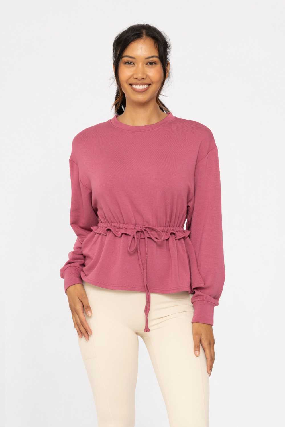 Stay cozy in our Soft Crew Neck Sweater, featuring a drawstring waist with a mini ruffle detail to transform it into a peplum blouse. Ideal for late-night movie dates, combining comfort with effortless style.