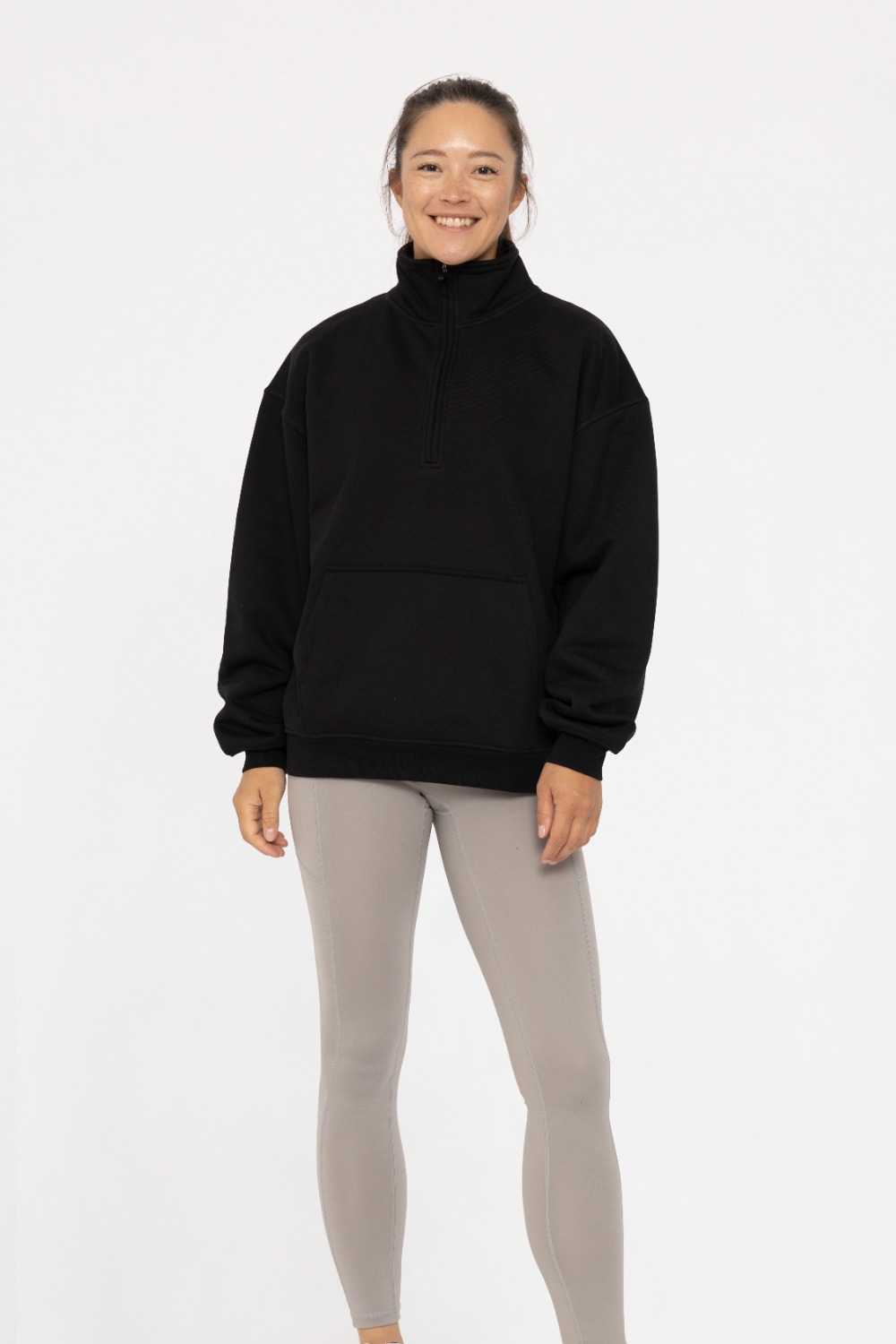 Embrace the chill in our cozy fleece pullover sweater. Featuring a mock neck and a discreet 1/4 front invisible zipper, this pullover offers a sleek look with the option for adjustable ventilation. The front kangaroo pocket adds a practical touch, perfect for keeping your hands warm or storing essentials, while the self-rib sleeve cuffs provide a snug fit. Crafted from plush fleece, this pullover is as cozy as it is stylish, making it a must-have for any casual wardrobe.