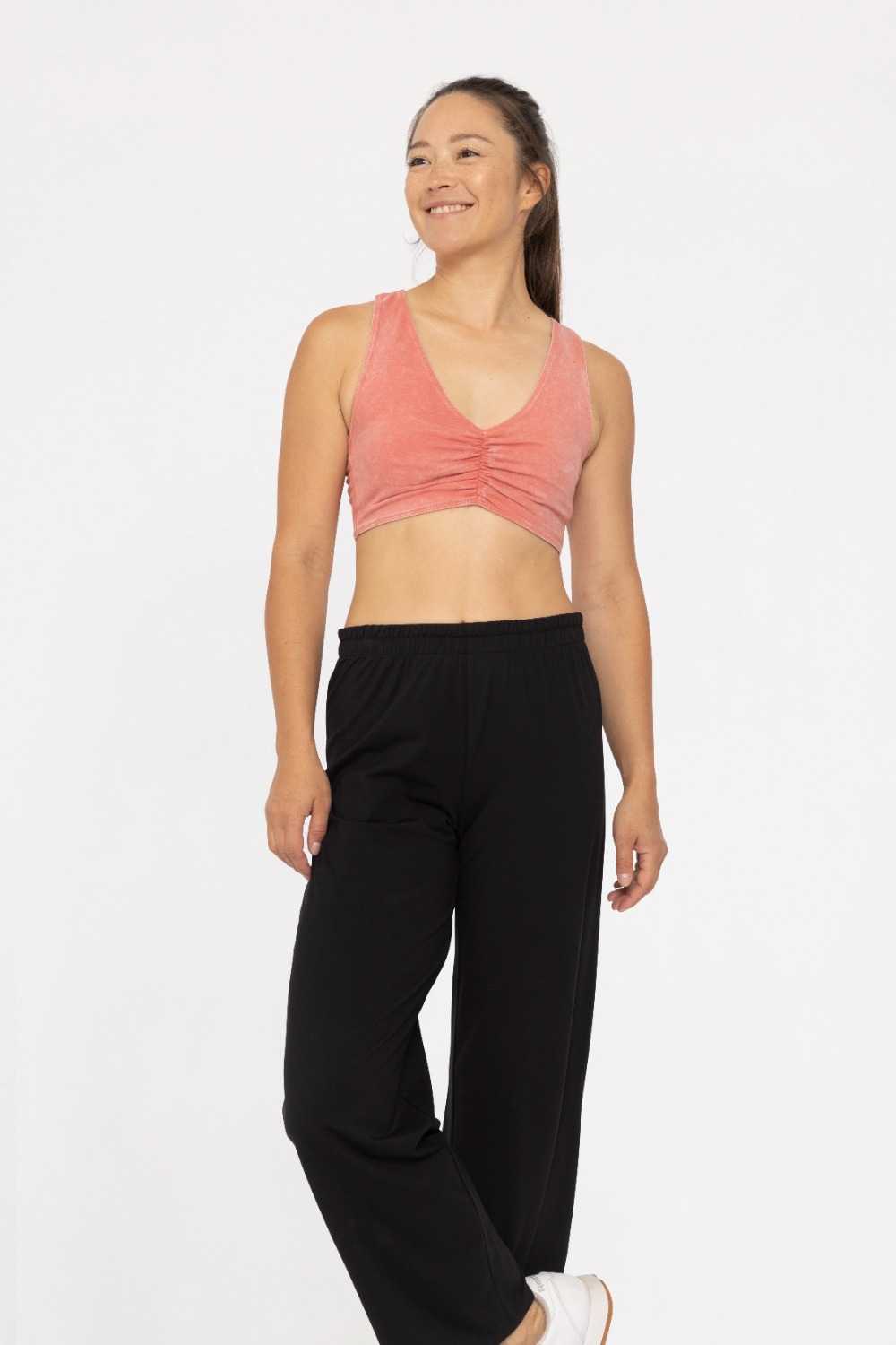 Perfect for everything from morning yoga to running errands, this bra offers the perfect blend of comfort, coverage, and style. Crafted from breathable cotton, this bra is designed for your active lifestyle with a supportive racerback that moves with you. The flattering V-neck shape and center front ruching add a touch of femininity, while providing great coverage and a secure fit.