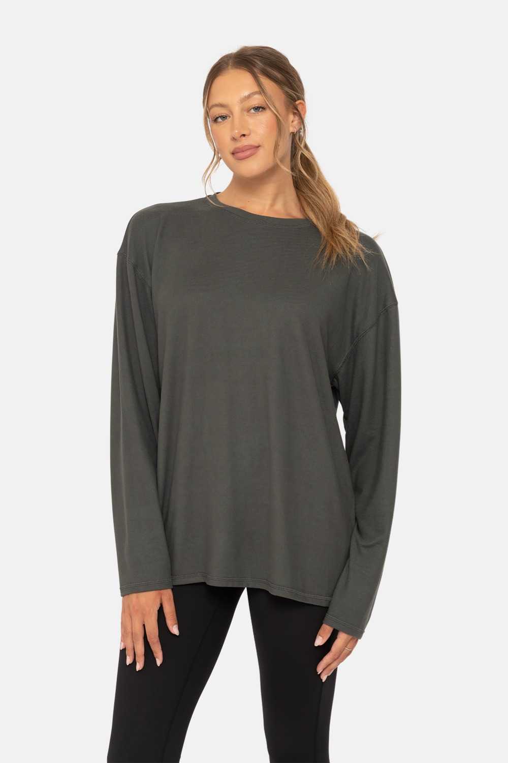 Boyfriend-fit long sleeve top in our best-selling solid-colored Hacci fabric. Features drop shoulders and a longer length, perfect for everyday wear or lounging comfortably on the couch.