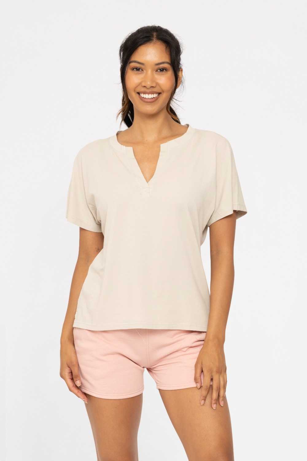 Loose boxy T-shirt with a henley neckline, offering comfort and style for lazy days. Soft hand feel, slight high-low hem, and side seam slits add a touch of casual elegance.