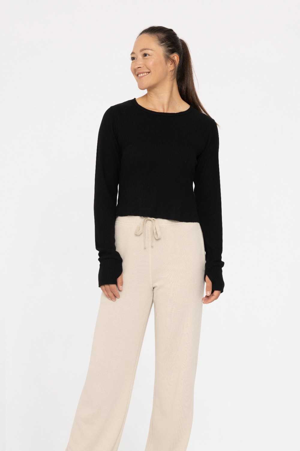 Perfect for layering or wearing solo, this top effortlessly combines comfort with a modern edge. Crafted from soft rib fabric, this long sleeve top features raw edge detailing at the seams for a touch of laid-back charm. The slim fit and high hip length create a flattering silhouette, while the cuffs with thumbholes offer extra warmth and a secure fit.