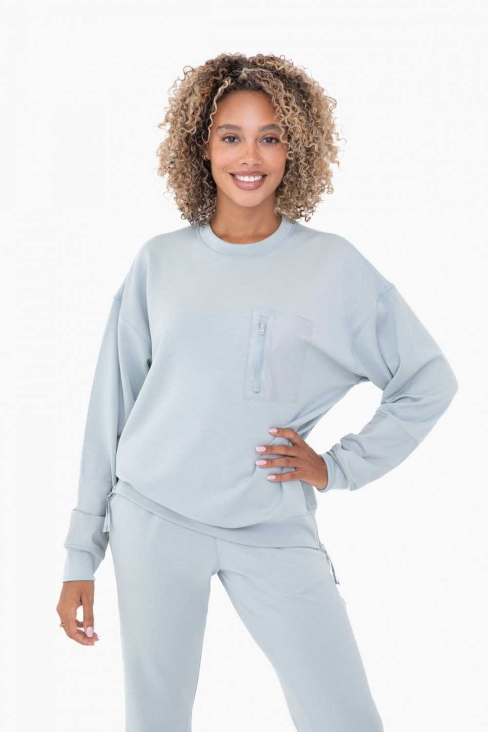 This classic crewneck is made from a mid weight modal blend jersey which gives it a silky handfeel with subtle drape. It features nylon paneled sleeves, a zippered chest pocket, and size seam zippers for added comfort and mobility.