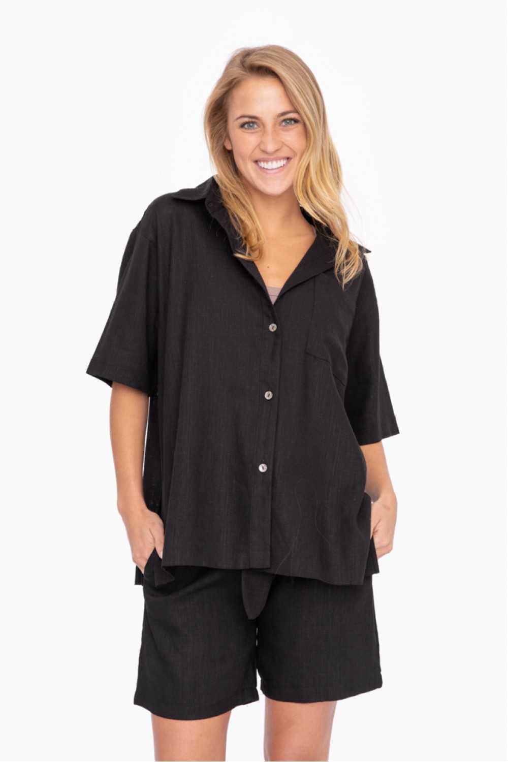 Indulge in resort chic with our Oasis Breeze Shirt. Rayon-linen blend, textured finish, and shell buttons embody cool, drapey luxury. The oversized vintage fit, along with vented side seams, elevates your style for the perfect blend of comfort and sophistication.