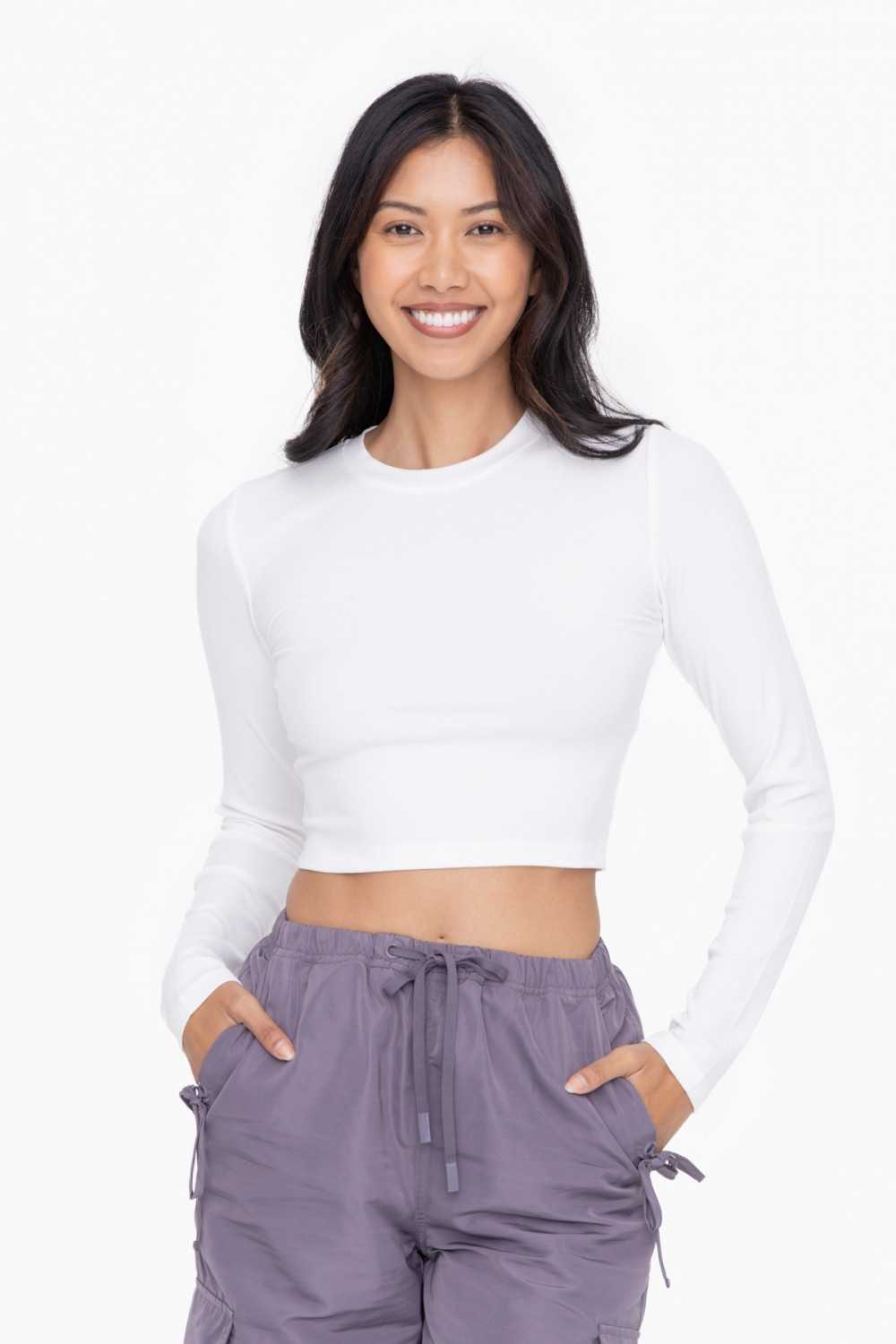 This form-fitting cropped shirt features a rounded neckline and long sleeves, making it perfect to layer over your favorite Mono B sports bra.