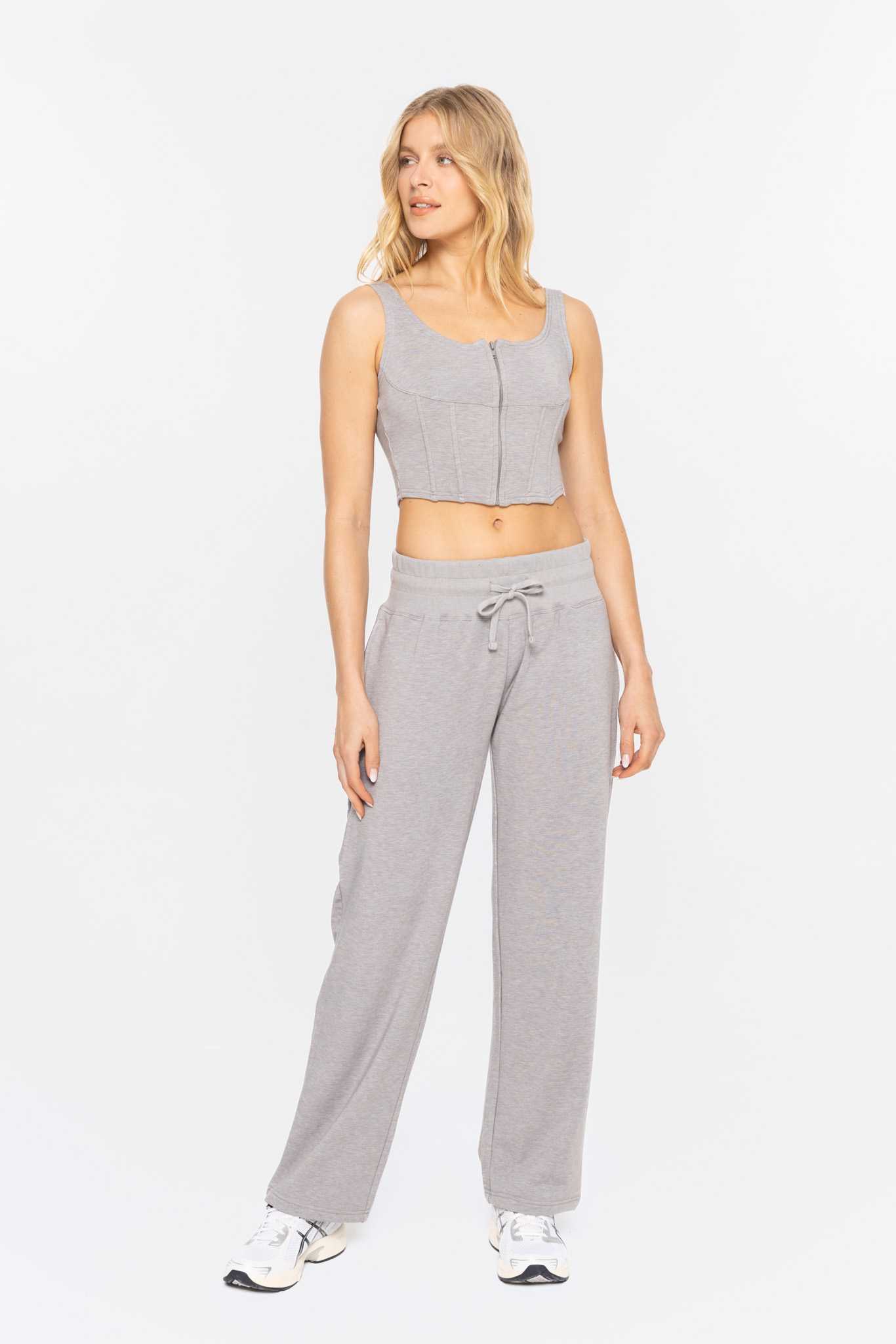 The perfect balance of sexy and sporty! This cropped corset inspired tank top features plastic boning and a center front zipper closure.