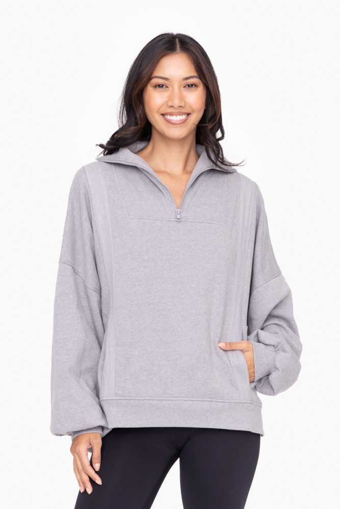 Get the perfect off-duty look without sacrificing style or comfort! Our oversized half zip mock neck pullover features ribbed cuffs and waistband, wide twill tape details, and a kangaroo pocket.