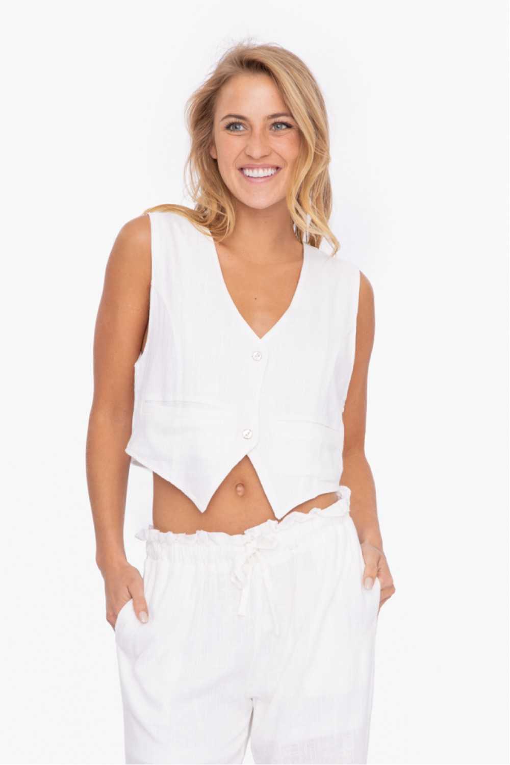 Introducing our Resort Elegance Crop Vest. Crafted from rayon-linen blend with a textured finish, the cool and drapey fabric meets shell buttons for refined style. This tailored vest, fully lined, features welt pockets, embodying sophistication in resort fashion.