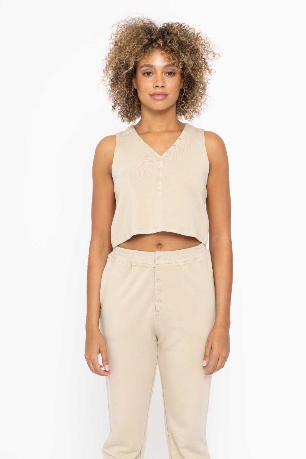 Indulge in luxury with our Tencel French terry collection: durable, cool to the touch, and irresistibly soft. Featuring a Henley-style neckline and snap-button front, our relaxed-fit cropped tank tops are perfect for layering. Complete your look with matching joggers or shorts. Elevate your loungewear with style.