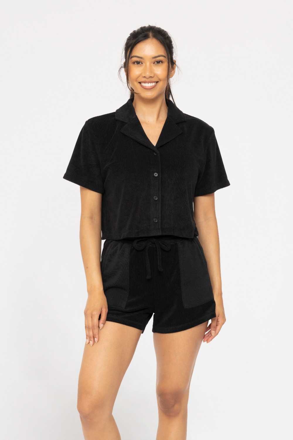 Relax in style with this terry loose-fit button-up shirt, featuring a classic lapel and collar. Perfect for layering or wearing on its own, this versatile piece offers comfort and a casual yet polished look.