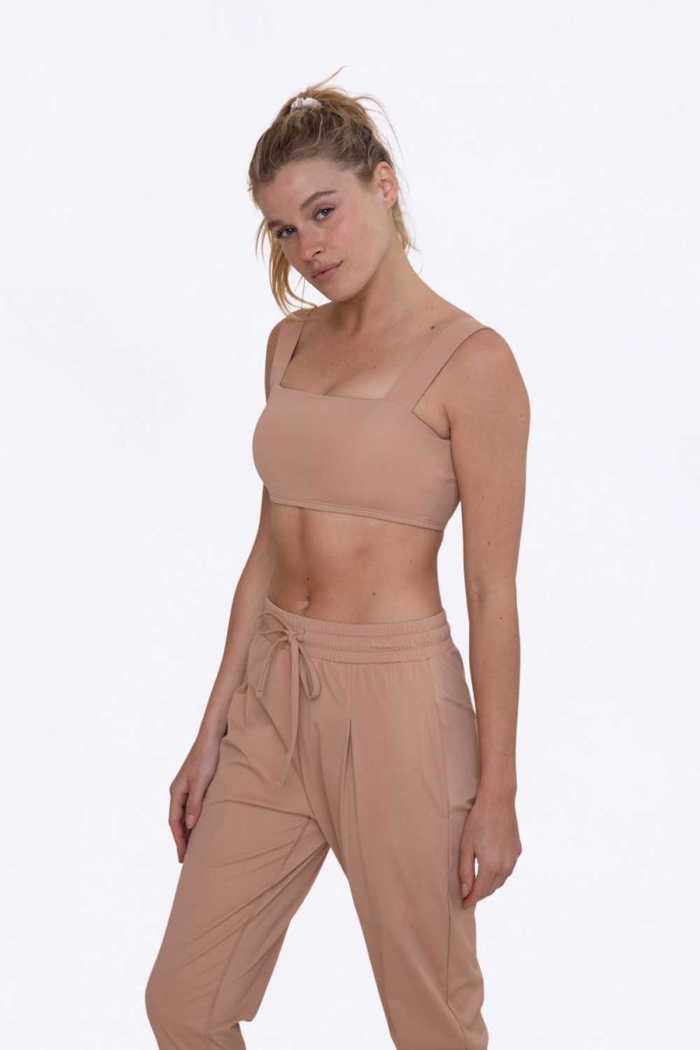 This square neck sports bra is constructed from silky nylon fabric and features wide supportive straps and a bandeau like silhouette.