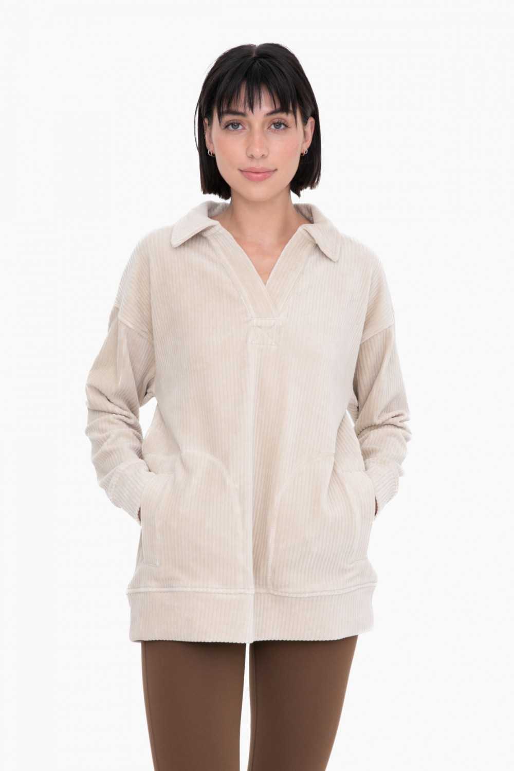 Soft and cozy, this collared pullover top is made from a stretchy corduroy fabric. It features an oversized tunic fit, split neck, oversized pockets, and cuffed sleeves & hem.