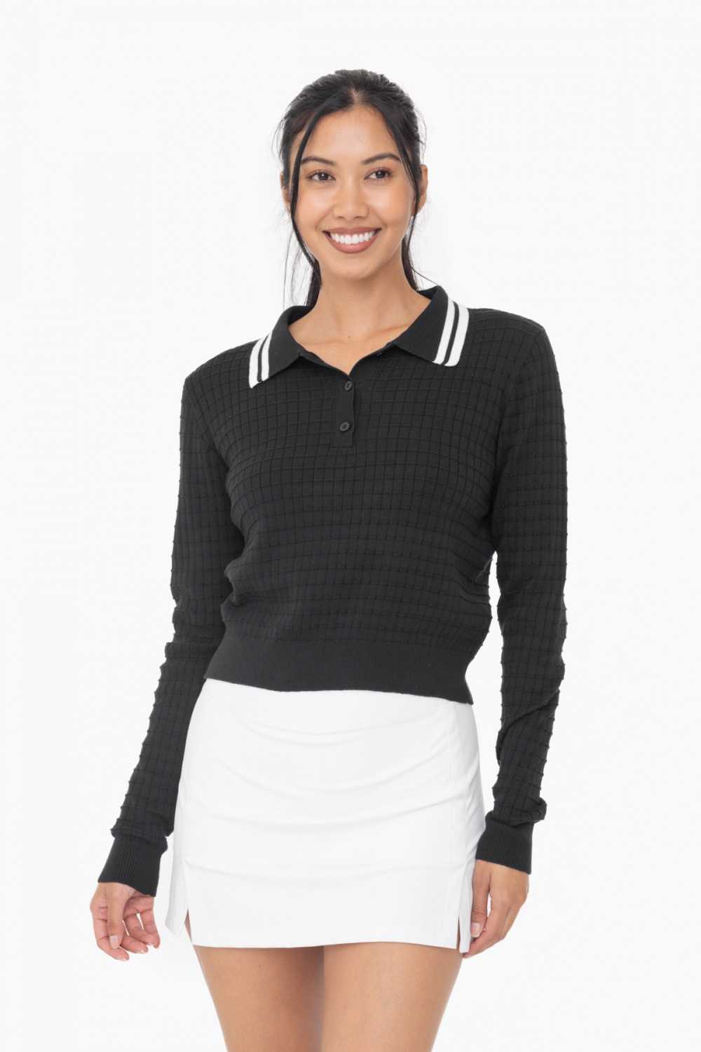 Take your golf or tennis looks to new heights with our collared knit sweater! Constructed from a jacquard grid style knit, this lightweight, long sleeve top features a preppy polo style collar with a retro stripe detail for a nostalgic feel and half button placket.